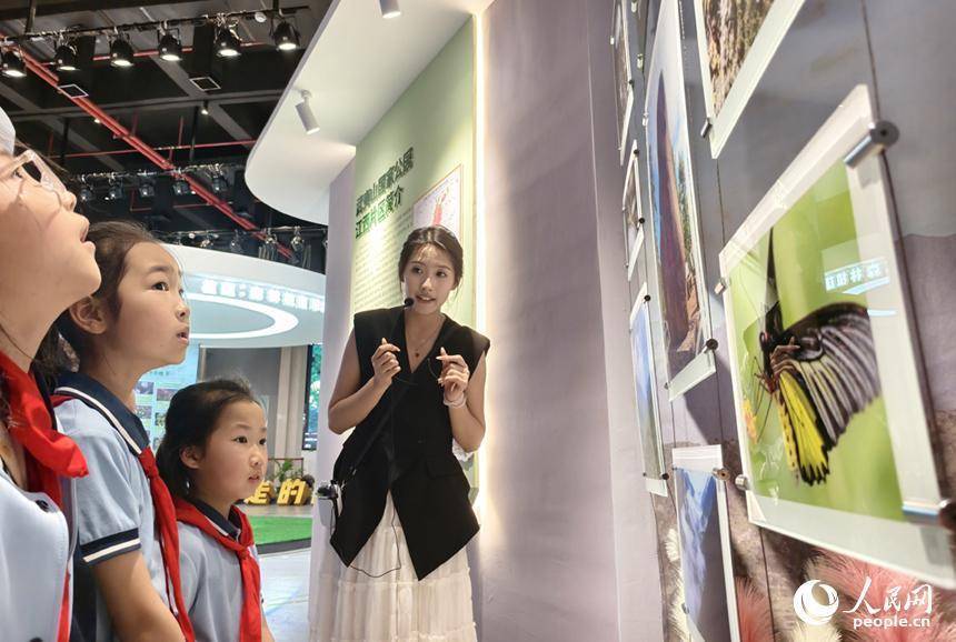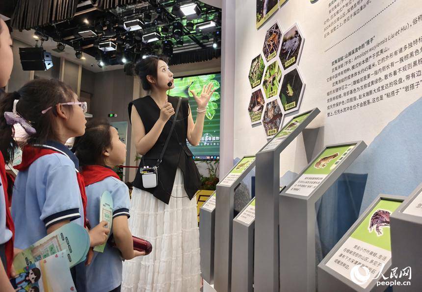 展馆工作人员为学生讲解生存在武夷山江西片区的珍稀动植物。人民网记者 时雨摄