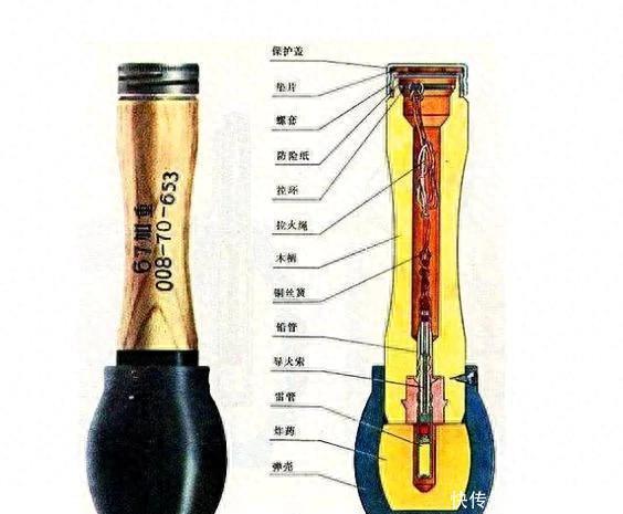 2.战略储备考量       冷战时期“早打、大打、打核战争”的战备思想推动了低成本、易生产的武器研发。67式采用铸铁弹体和TNT装药,生产工艺简单,全国数十家兵工厂均可量产,最高峰时库存达15亿枚,按“士兵20枚、民兵4枚、群众1枚”的标准武装全民。 二、结构与性能参数       1.核心设计       铸铁弹体:厚度0.5厘米,内装38克TNT炸药,爆炸时产生70-110片不规则破片,杀伤半径7米,破片最远飞行80米仍具杀伤力。       木柄发火系统:采用拉火管-导火索-雷管结构,引信延迟时间3-3.7秒。木柄长125毫米,表面刻防滑纹,全弹长204毫米,总重600克。       工艺特点:弹体铸造后经表面磷化处理,木柄涂防水漆,但长期储存仍可能因受潮导致导火索失效。       2.性能局限       重量问题:600克的全重导致单兵携带量有限(通常4枚),投掷距离仅30-40米,远低于士兵训练时的极限成绩(如102米世界纪录)。